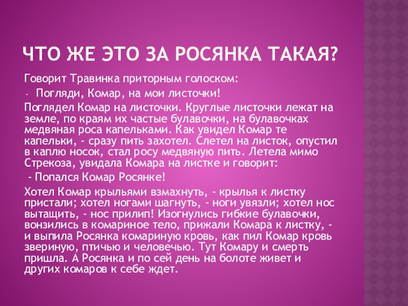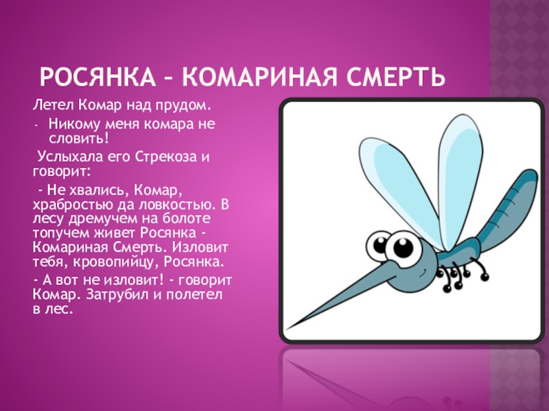 - Не хвались, Комар, храбростью да ловкостью. В лесу дремучем на болоте топучем живет Росянка - Комариная Смерть. Изловит тебя, кровопийцу, Росянка.