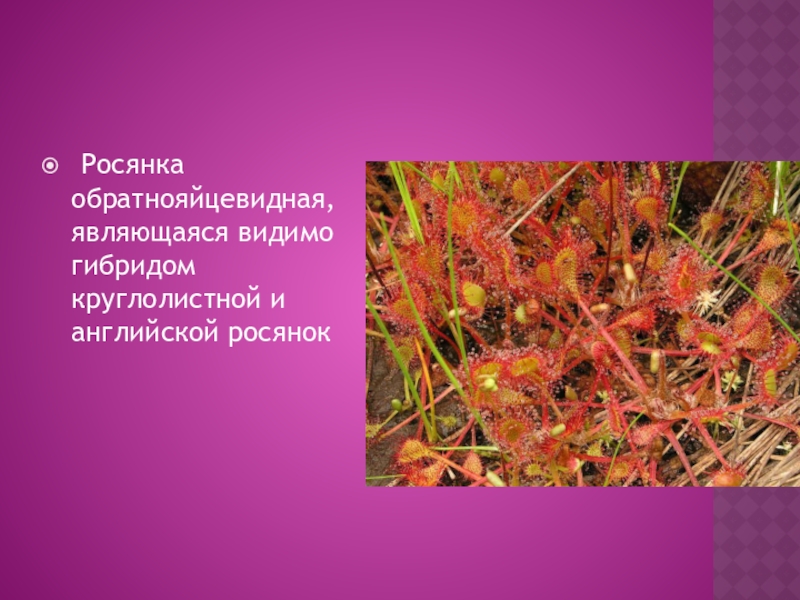 Слайд 14 Росянка обратнояйцевидная, являющаяся видимо гибридом круглолистной и английской росянок