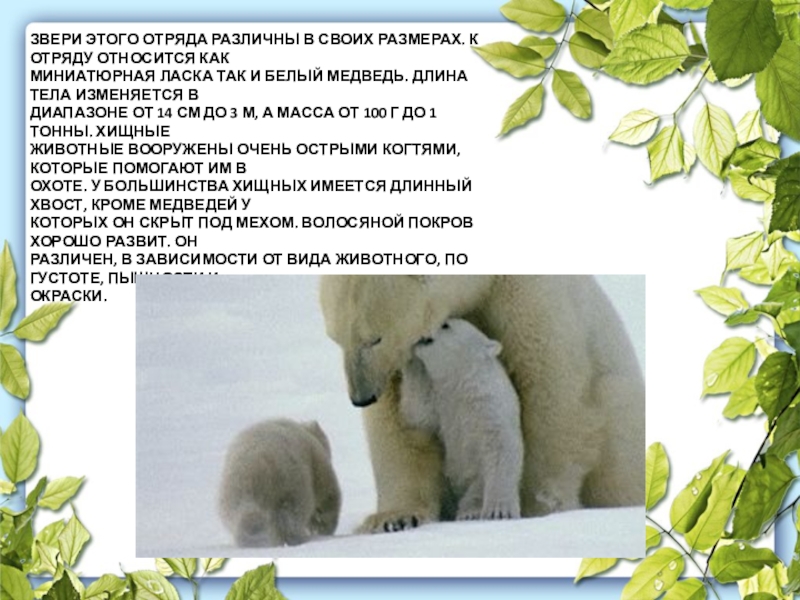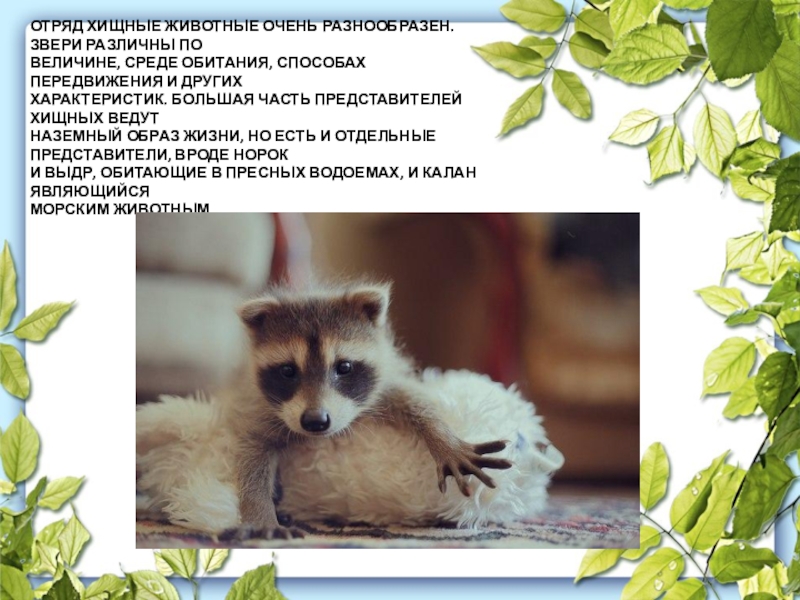 Слайд 5ОТРЯД ХИЩНЫЕ ЖИВОТНЫЕ ОЧЕНЬ РАЗНООБРАЗЕН. ЗВЕРИ РАЗЛИЧНЫ ПО