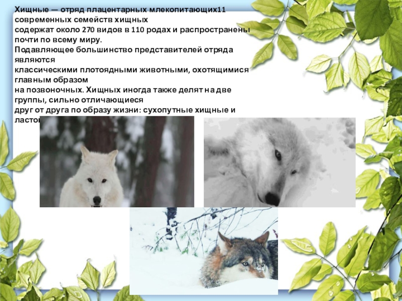 Слайд 2Хищные — отряд плацентарных млекопитающих11 современных семейств хищных