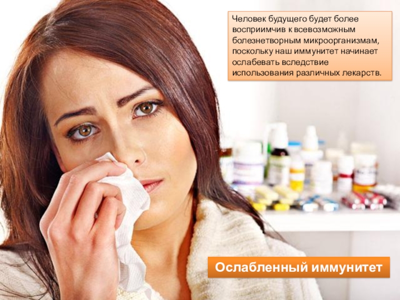Слайд 14Человек будущего будет более восприимчив к всевозможным болезнетворным микроорганизмам, поскольку наш