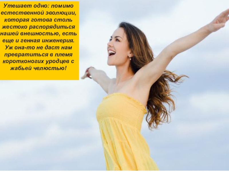 внешностью, есть еще и генная инженерия. Уж она-то не даст нам превратиться в племя коротконогих уродцев с жабьей челюстью!
