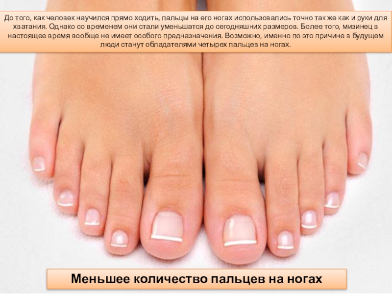 использовались точно так же как и руки для хватания. Однако со временем они стали уменьшатся до сегодняшних размеров. Более того, мизинец в настоящее время вообще не имеет особого предназначения. Возможно, именно по это причине в будущем люди станут обладателями четырех пальцев на ногах.