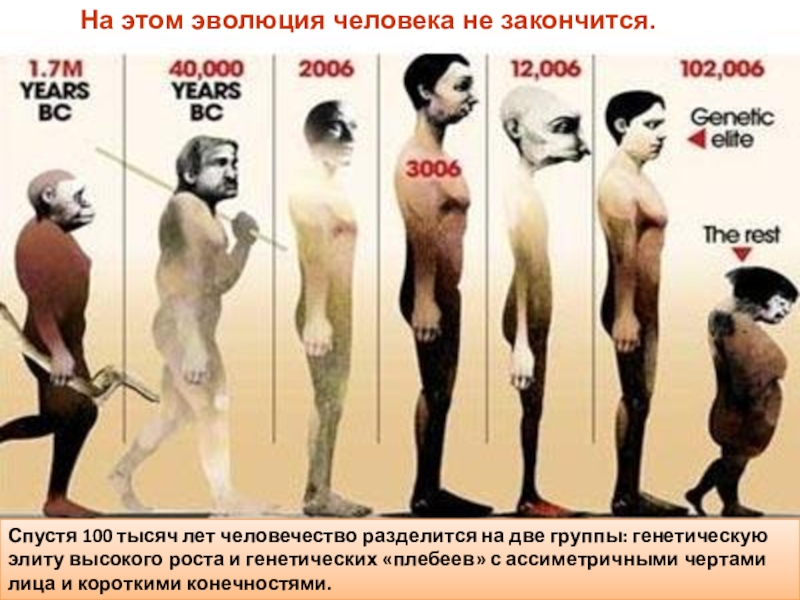 Спустя 100 тысяч лет человечество разделится на две группы: генетическую элиту высокого роста и генетических «плебеев» с ассиметричными чертами лица и короткими конечностями.
