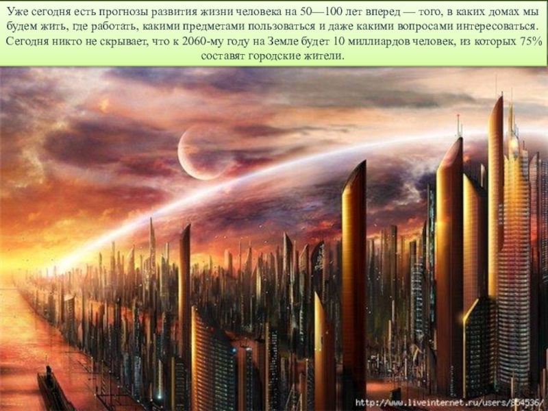 — того, в каких домах мы будем жить, где работать, какими предметами пользоваться и даже какими вопросами интересоваться. Сегодня никто не скрывает, что к 2060-му году на Земле будет 10 миллиардов человек, из которых 75% составят городские жители.