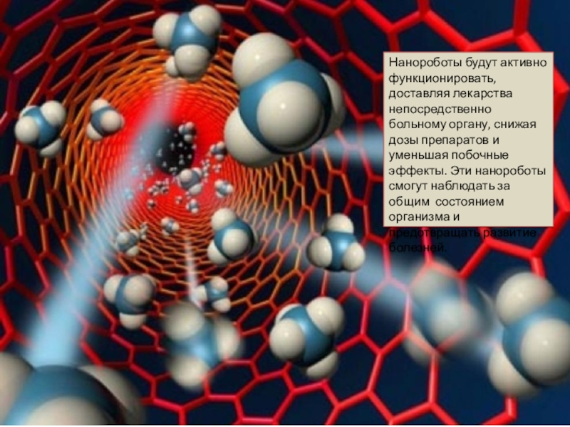 Слайд 28Нанороботы будут активно функционировать, доставляя лекарства непосредственно больному органу, снижая дозы
