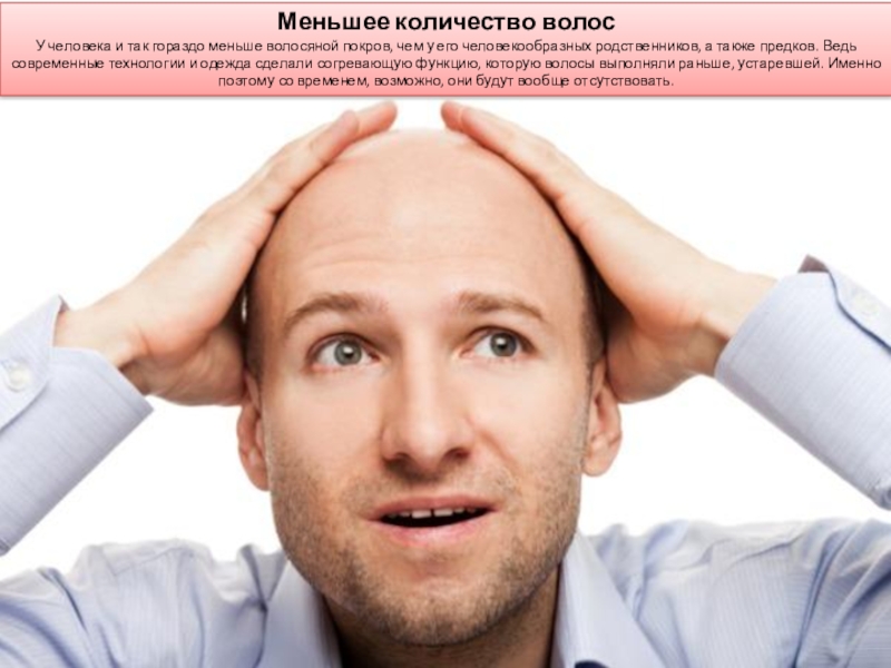 у его человекообразных родственников, а также предков. Ведь современные технологии и одежда сделали согревающую функцию, которую волосы выполняли раньше, устаревшей. Именно поэтому со временем, возможно, они будут вообще отсутствовать.