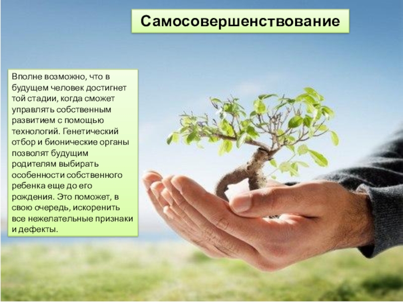 управлять собственным развитием с помощью технологий. Генетический отбор и бионические органы позволят будущим родителям выбирать особенности собственного ребенка еще до его рождения. Это поможет, в свою очередь, искоренить все нежелательные признаки и дефекты.