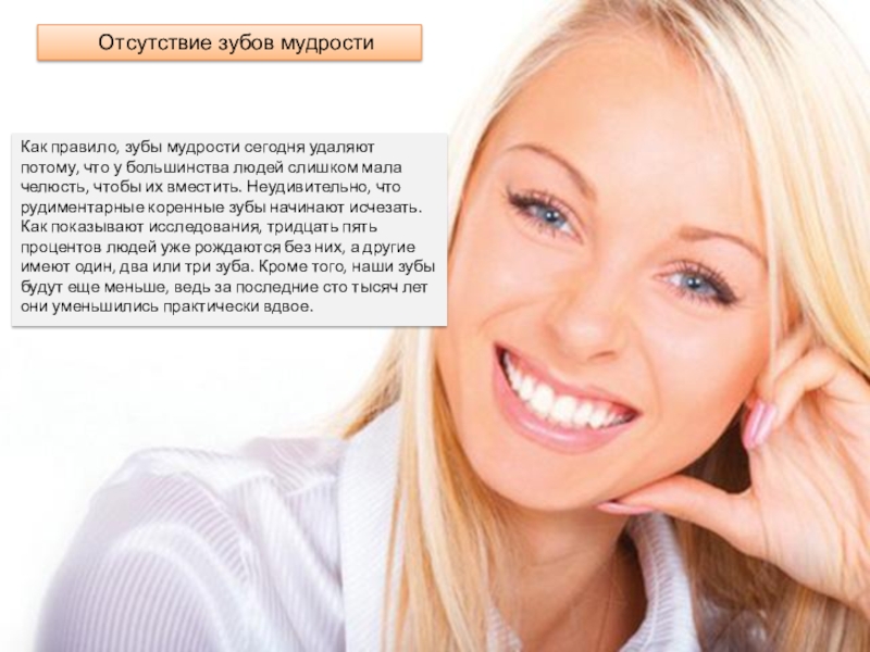 Слайд 19Как правило, зубы мудрости сегодня удаляют потому, что у большинства людей