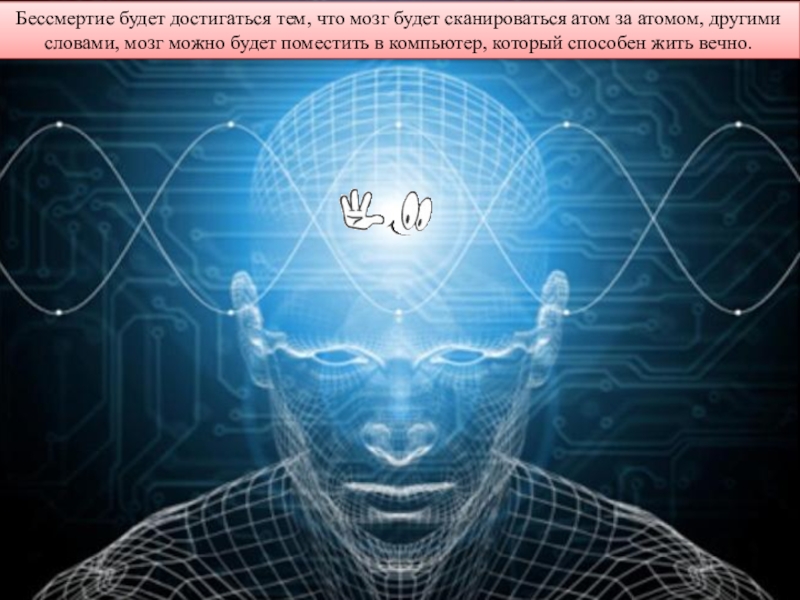 Слайд 32Бессмертие будет достигаться тем, что мозг будет сканироваться атом за атомом,