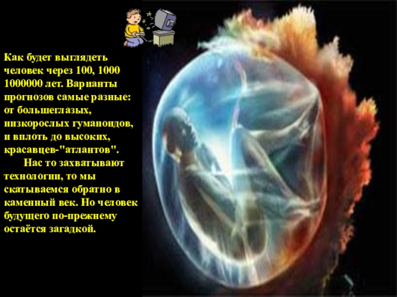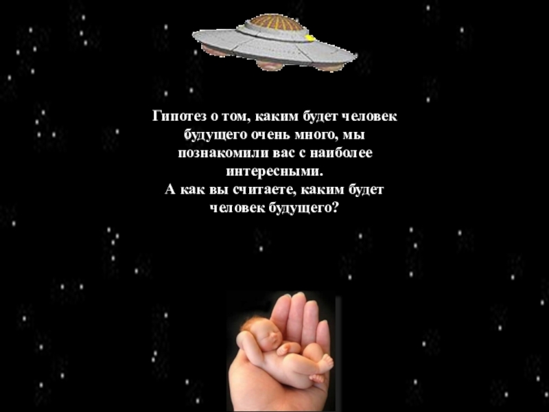 Слайд 45Гипотез о том, каким будет человек будущего очень много, мы познакомили