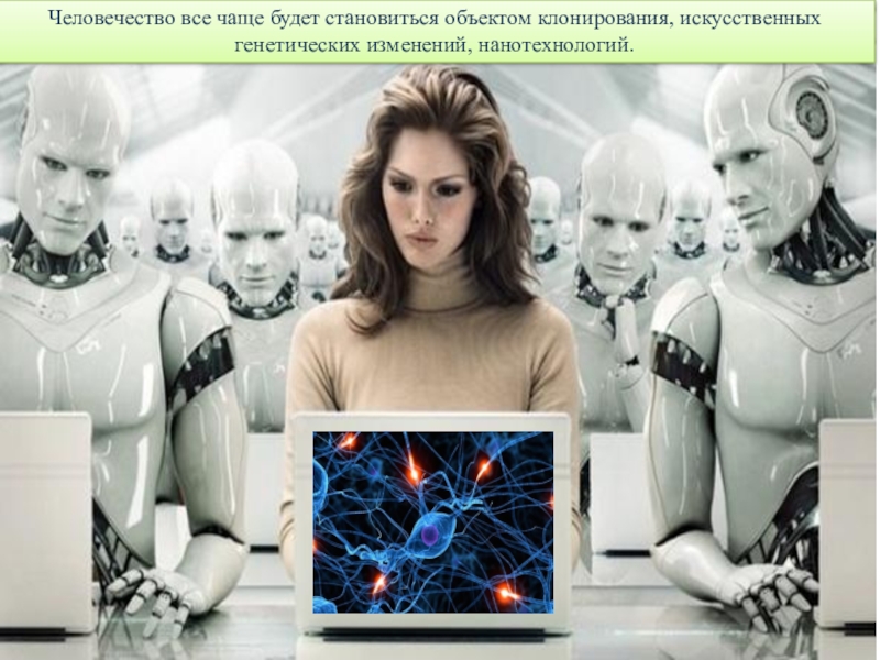 Слайд 30Человечество все чаще будет становиться объектом клонирования, искусственных генетических изменений, нанотехнологий.