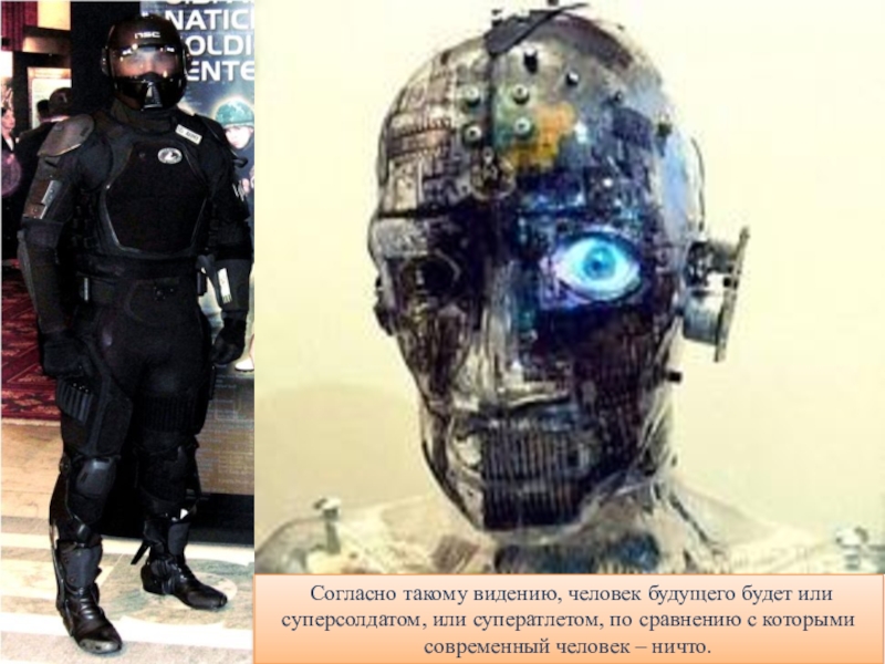 Слайд 31 Согласно такому видению, человек будущего будет или суперсолдатом, или суператлетом,