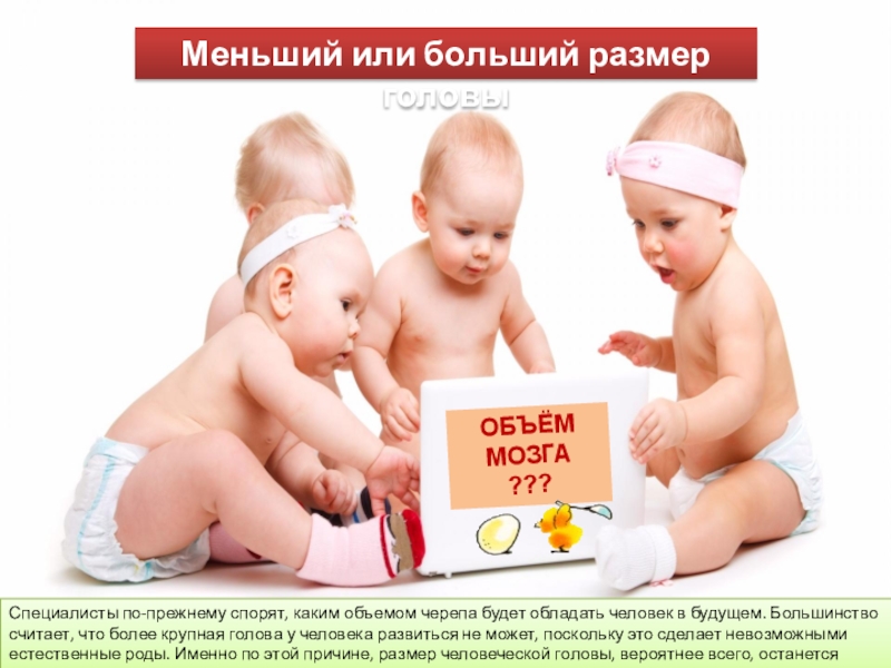 в будущем. Большинство считает, что более крупная голова у человека развиться не может, поскольку это сделает невозможными естественные роды. Именно по этой причине, размер человеческой головы, вероятнее всего, останется прежним, а может и уменьшится.