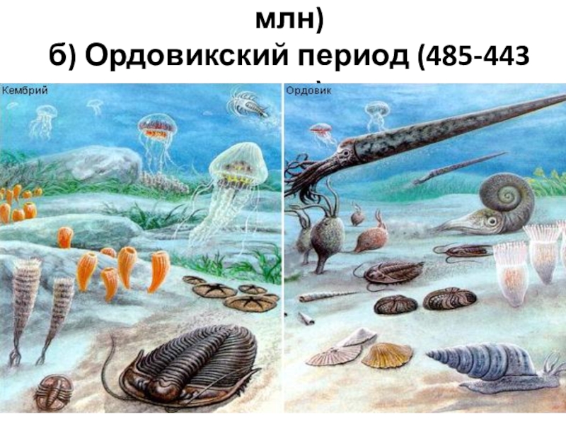 Слайд 5а)Кембрийский период (541-485 млн) б) Ордовикский период (485-443 млн)