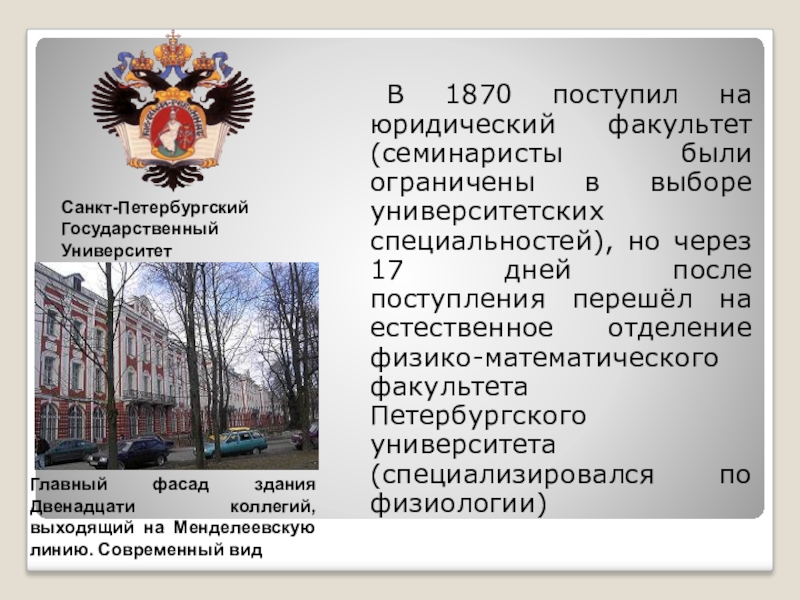 Главный фасад здания Двенадцати коллегий, выходящий на Менделеевскую линию. Современный вид