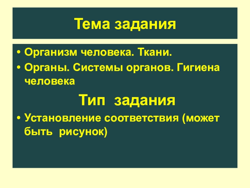 Тема заданияОрганизм человека. Ткани.Органы. Системы органов. Гигиена человека Тип заданияУстановление соответствия (может быть рисунок)
