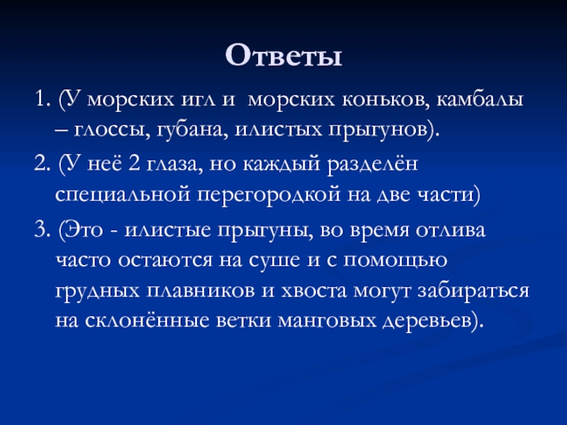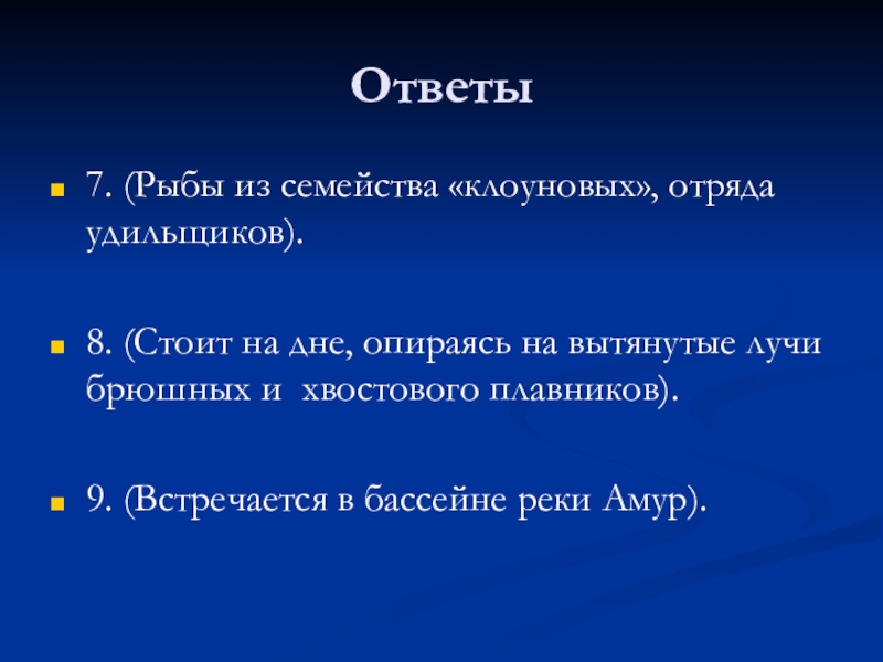 Ответы7. (Рыбы из семейства «клоуновых», отряда удильщиков).8. (Стоит на дне, опираясь на вытянутые лучи брюшных и хвостового