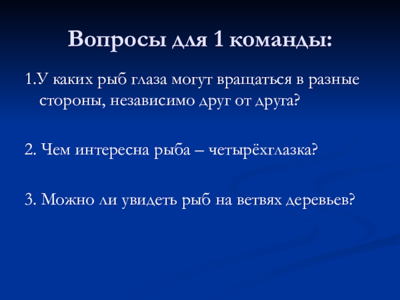 Вопросы для 1 команды:1.У каких рыб глаза могут вращаться в разные стороны, независимо друг от друга?2. Чем интересна рыба – четырёхглазка?3. Можно ли увидеть рыб на ветвях деревьев?