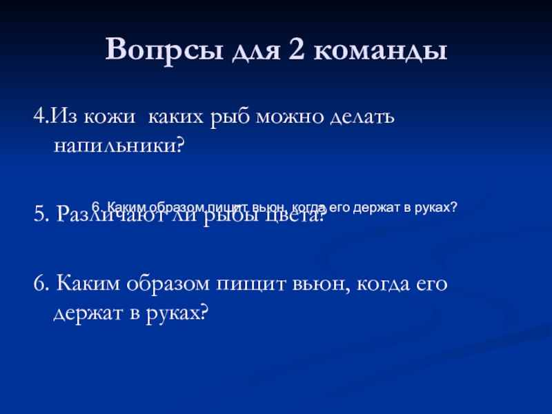Вопрсы для 2 команды4.Из кожи каких рыб можно делать напильники?5. Различают ли рыбы цвета?6. Каким образом пищит