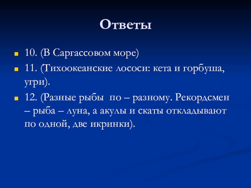 Ответы10. (В Саргассовом море)11. (Тихоокеанские лососи: кета и горбуша, угри).12. (Разные рыбы по – разному. Рекордсмен –