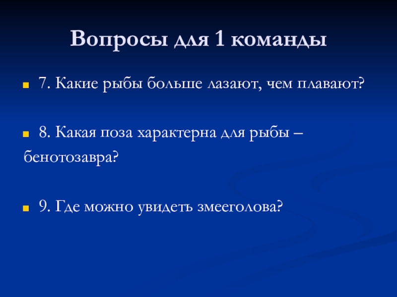 Вопросы для 1 команды7. Какие рыбы больше лазают, чем плавают?8. Какая поза характерна для рыбы – бенотозавра?9.