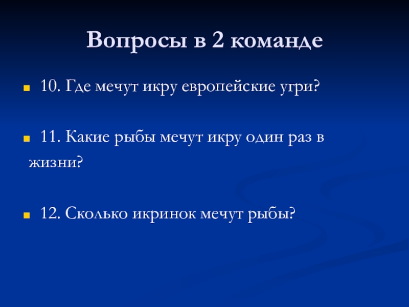 Вопросы в 2 команде10. Где мечут икру европейские угри?11. Какие рыбы мечут икру один раз в жизни?12.