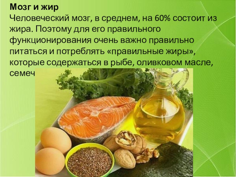 Поэтому для его правильного функционирования очень важно правильно питаться и потреблять «правильные жиры», которые содержаться в рыбе, оливковом масле, семечках, орехах.