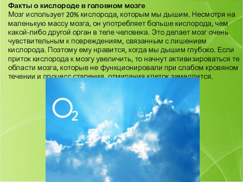 мы дышим. Несмотря на маленькую массу мозга, он употребляет больше кислорода, чем какой-либо другой орган в теле человека. Это делает мозг очень чувствительным к повреждениям, связанным с лишением кислорода. Поэтому ему нравится, когда мы дышим глубоко. Если приток кислорода к мозгу увеличить, то начнут активизироваться те области мозга, которые не функционировали при слабом кровяном течении и процесс старения, отмирания клеток замедлится.