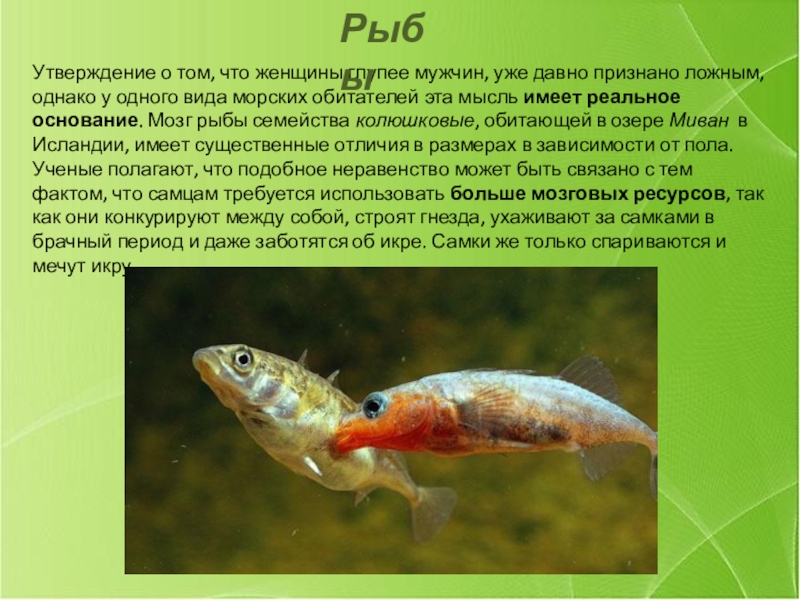 однако у одного вида морских обитателей эта мысль имеет реальное основание. Мозг рыбы семейства колюшковые, обитающей в озере Миван в Исландии, имеет существенные отличия в размерах в зависимости от пола. Ученые полагают, что подобное неравенство может быть связано с тем фактом, что самцам требуется использовать больше мозговых ресурсов, так как они конкурируют между собой, строят гнезда, ухаживают за самками в брачный период и даже заботятся об икре. Самки же только спариваются и мечут икру.