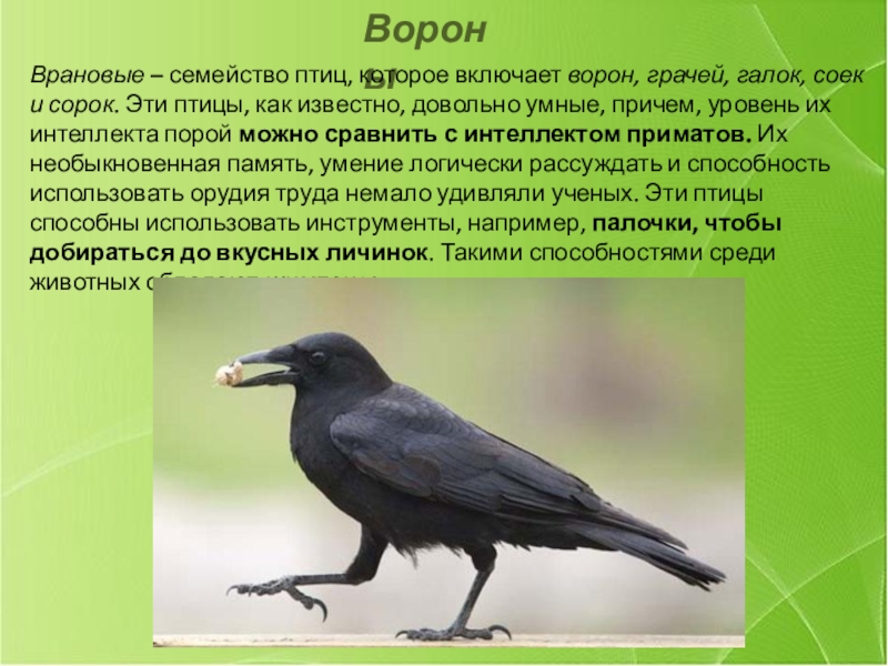 Врановые – семейство птиц, которое включает ворон, грачей, галок, соек и сорок. Эти