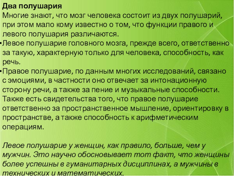 Левое полушарие у женщин, как правило, больше, чем у мужчин. Это научно обосновывает тот факт, что женщины более успешны в гуманитарных дисциплинах, а мужчины в технических и математических.