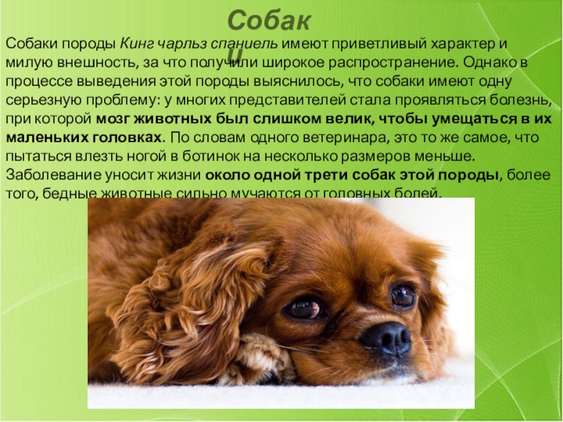получили широкое распространение. Однако в процессе выведения этой породы выяснилось, что собаки имеют одну серьезную проблему: у многих представителей стала проявляться болезнь, при которой мозг животных был слишком велик, чтобы умещаться в их маленьких головках. По словам одного ветеринара, это то же самое, что пытаться влезть ногой в ботинок на несколько размеров меньше. Заболевание уносит жизни около одной трети собак этой породы, более того, бедные животные сильно мучаются от головных болей.