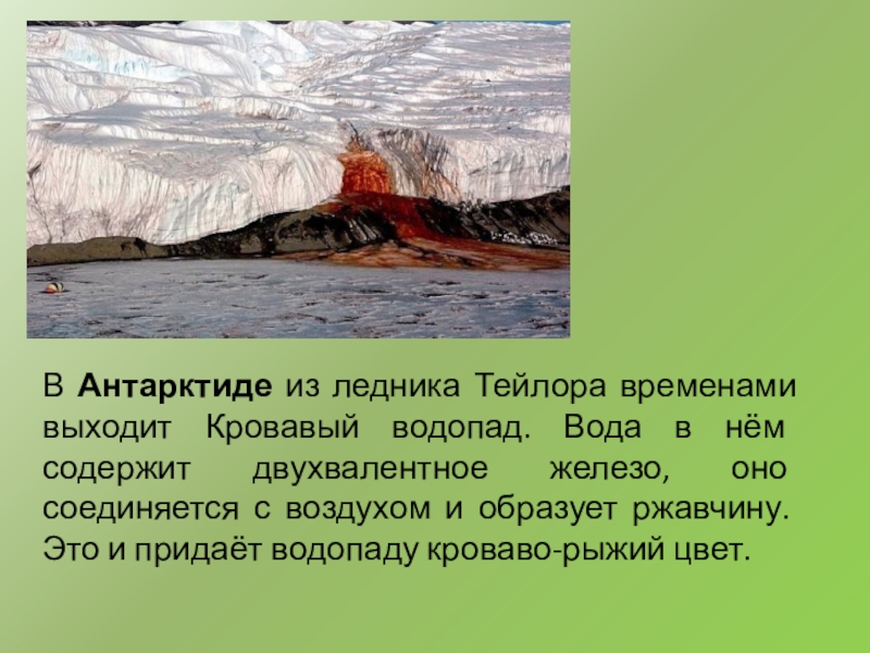 Слайд 3В Антарктиде из ледника Тейлора временами выходит Кровавый водопад. Вода в
