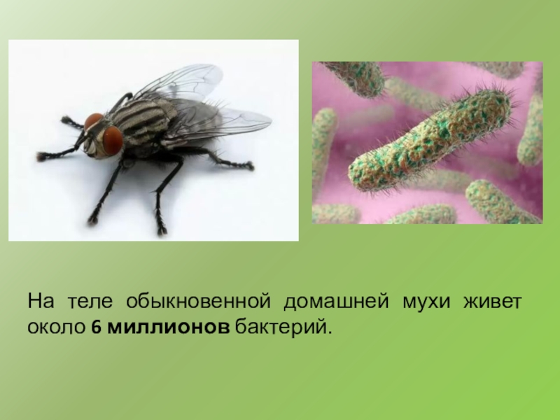 Слайд 7На теле обыкновенной домашней мухи живет около 6 миллионов бактерий.