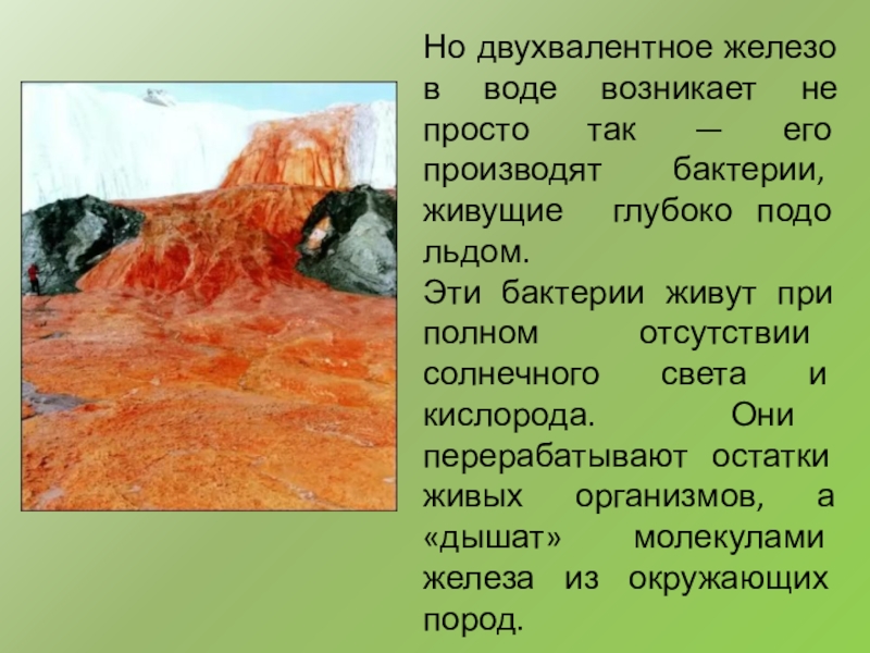 Но двухвалентное железо в воде возникает не просто так — его производят бактерии, живущие глубоко подо льдом.