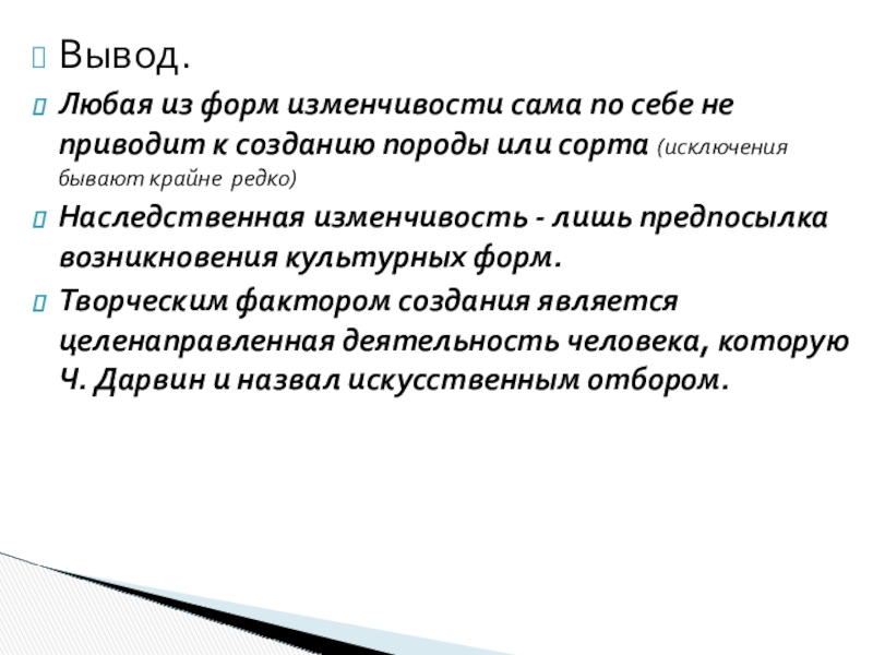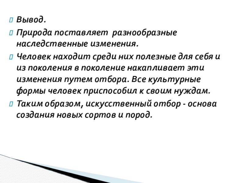 Вывод.Природа поставляет разнообразные наследственные изменения. Человек находит среди них полезные для себя и из поколения в поколение