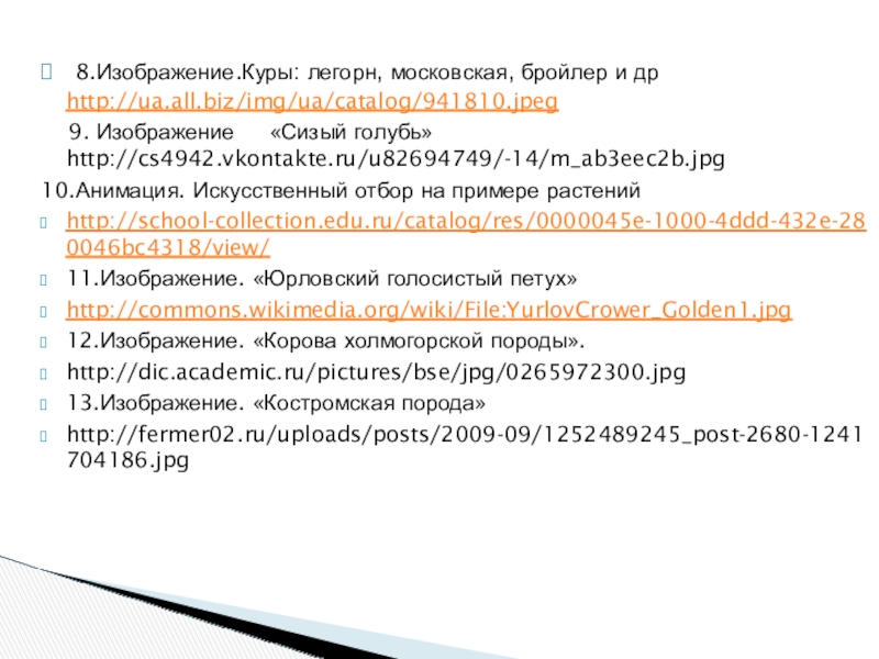 8.Изображение.Куры: легорн, московская, бройлер и др http://ua.all.biz/img/ua/catalog/941810.jpeg  9. Изображение   «Сизый голубь» http://cs4942.vkontakte.ru/u82694749/-14/m_ab3eec2b.jpg10.Анимация. Искусственный