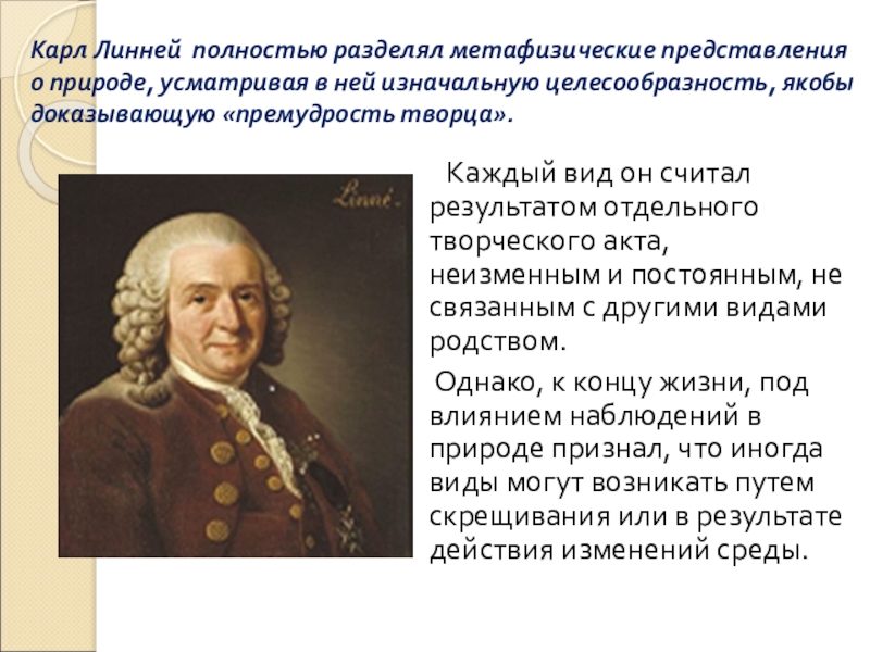 Слайд 4Карл Линней полностью разделял метафизические представления о природе, усматривая в ней