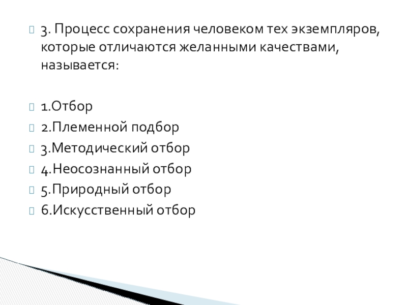 3. Процесс сохранения человеком тех экземпляров, которые отличаются желанными качествами, называется:1.Отбор2.Племенной подбор3.Методический отбор4.Неосознанный отбор5.Природный отбор6.Искусственный отбор