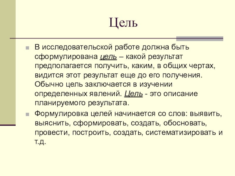 получить, каким, в общих чертах, видится этот результат еще до его получения. Обычно цель заключается в изучении определенных явлений. Цель - это описание планируемого результата.