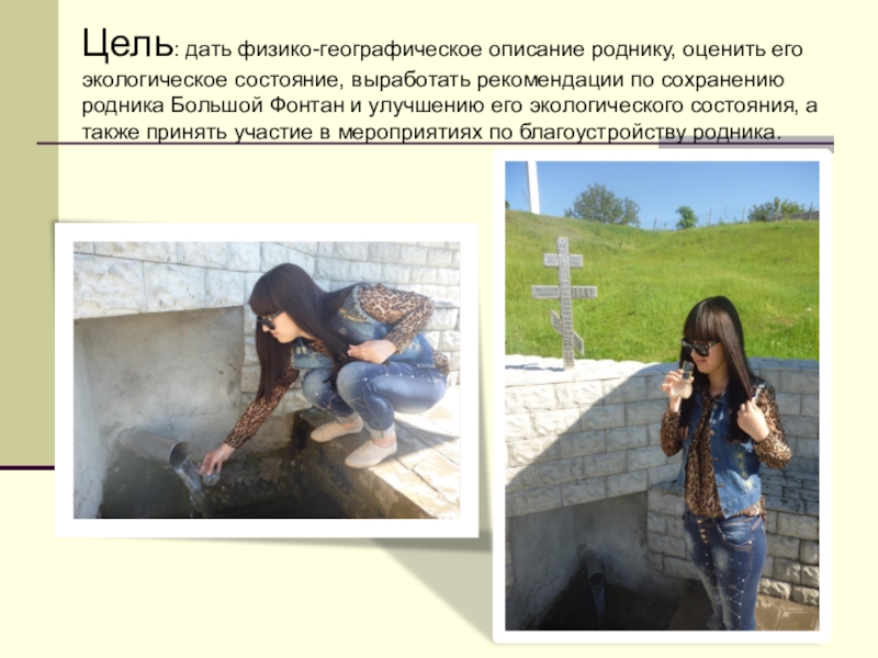 Слайд 16Цель: дать физико-географическое описание роднику, оценить его экологическое состояние, выработать рекомендации