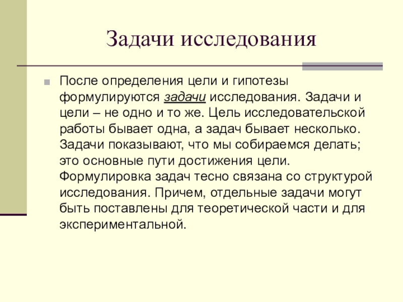 После определения цели и гипотезы формулируются задачи исследования. Задачи и
