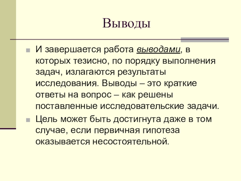 излагаются результаты исследования. Выводы – это краткие ответы на вопрос – как решены поставленные исследовательские задачи.