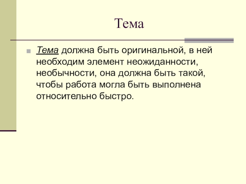 Тема должна быть оригинальной, в ней необходим элемент неожиданности, необычности, она