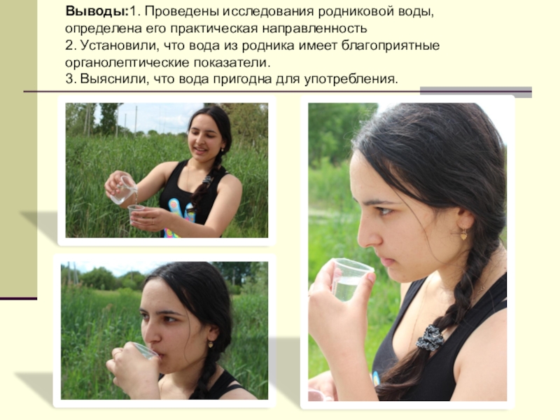 Слайд 19Выводы:1. Проведены исследования родниковой воды, определена его практическая направленность