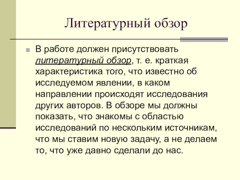 того, что известно об исследуемом явлении, в каком направлении происходят исследования других авторов. В обзоре мы должны показать, что знакомы с областью исследований по нескольким источникам, что мы ставим новую задачу, а не делаем то, что уже давно сделали до нас.