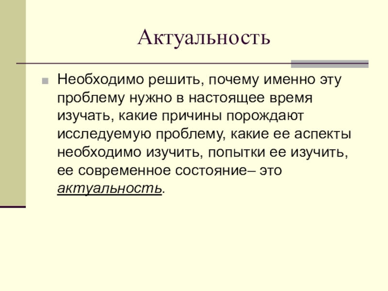 какие причины порождают исследуемую проблему, какие ее аспекты необходимо изучить, попытки ее изучить, ее современное состояние– это актуальность.