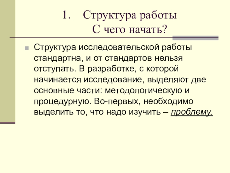 отступать. В разработке, с которой начинается исследование, выделяют две основные части: методологическую и процедурную. Во-первых, необходимо выделить то, что надо изучить – проблему.