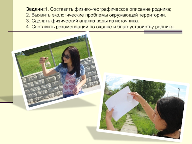 Слайд 18Задачи:1. Составить физико-географическое описание родника;